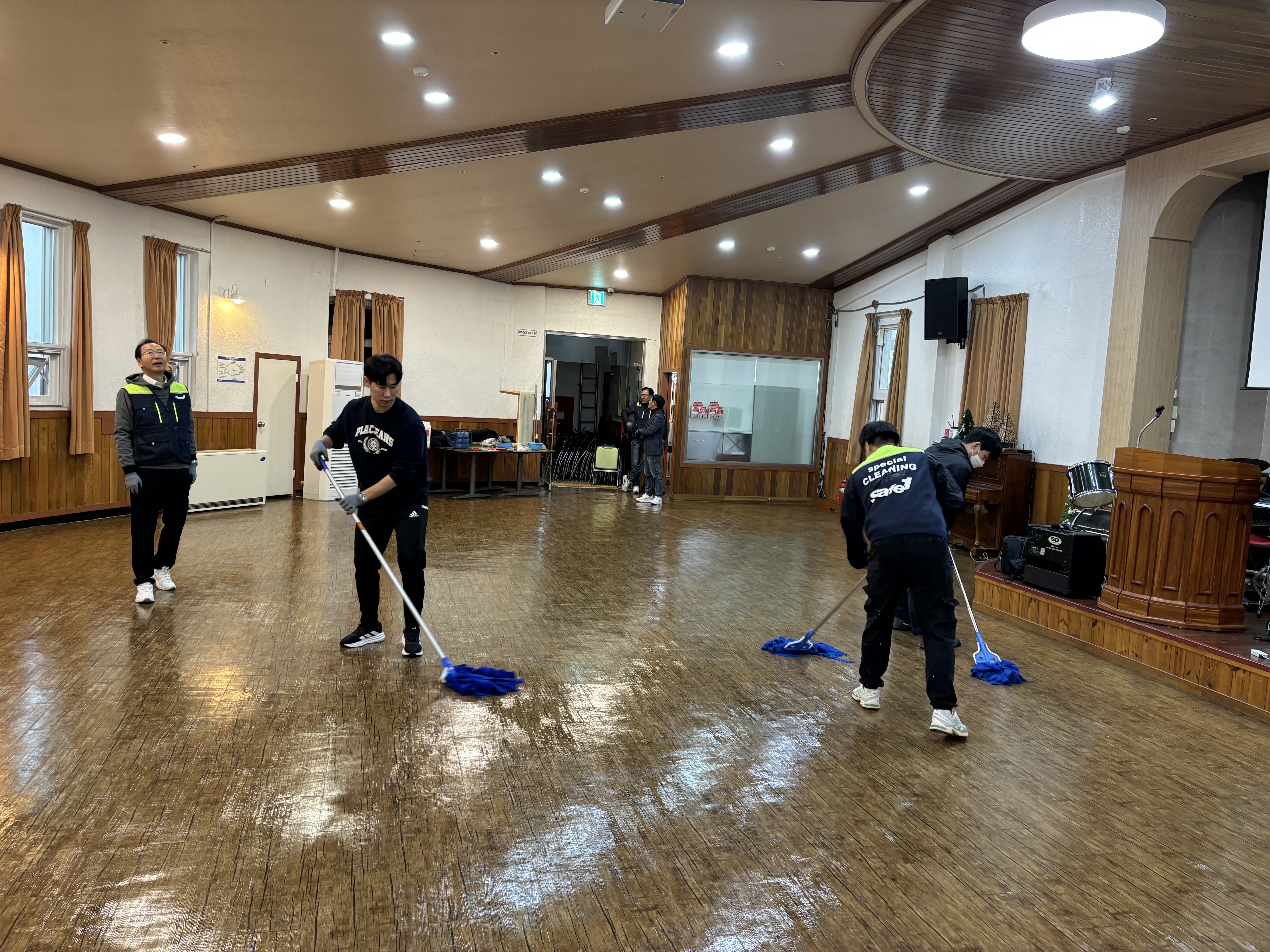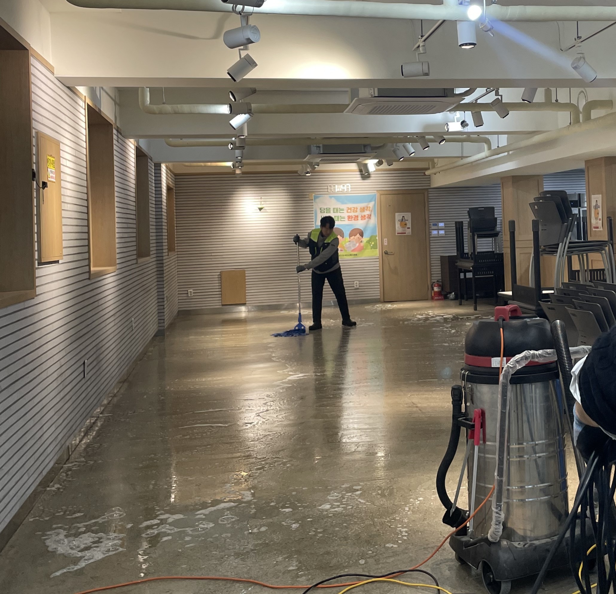 특히 이용자분들이 자주 사용하는 강당 바닥은 오염도와 사용 흔적이 많은 공간인 만큼,