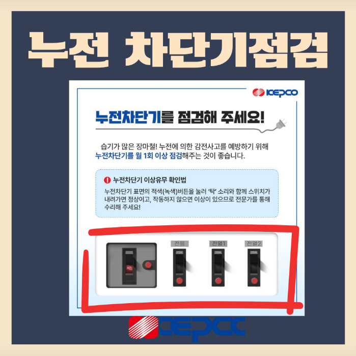 • 장마 시작 전, 반드시 누전차단기 테스트 등 정상 작동 여부 확인